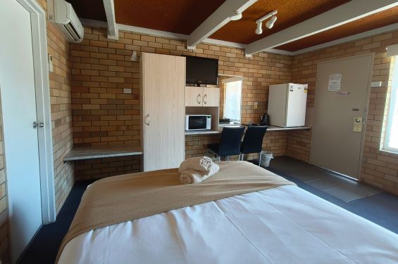 This motel room has a queen-size bed and a single bed. The room includes air conditioning to ensure a comfortable environment and an in-room heater and electric blankets are also included for added comfort in colder weather. There is a desk available for work or study purposes. A hairdryer, alarm clock and iron and ironing board is available for your convenience. You can enjoy fresh air with the opening windows, and listen to music or news on the radio. A bar-sized refrigerator is provided to store drinks and snacks and there is a microwave. Entertainment is covered with a TV featuring satellite or cable channels. The room has a shower and tea and coffee-making facilities are available for a quick refreshment. Complimentary WiFi is provided to keep you connected during your stay.
